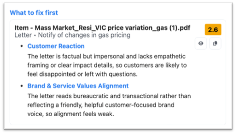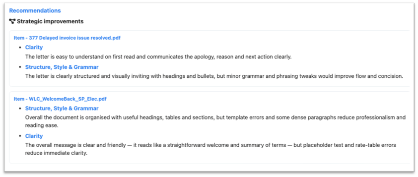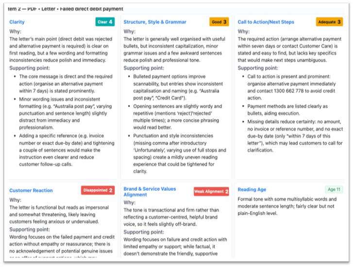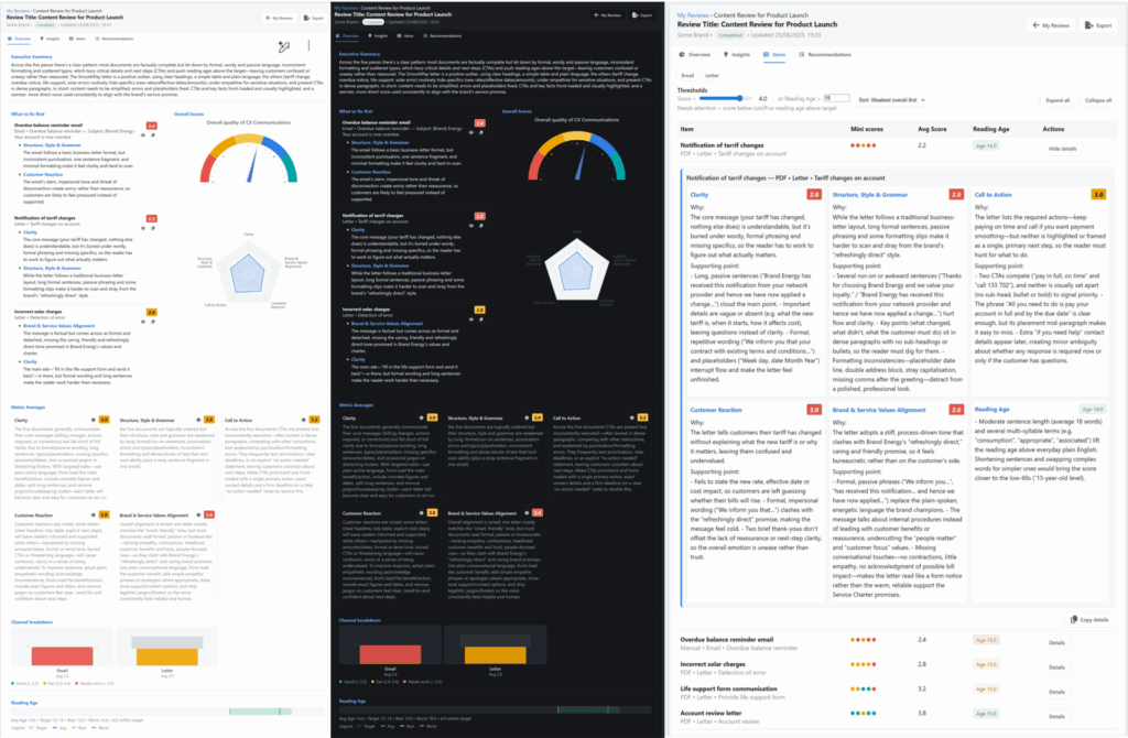 - Real-Time Assessment: Instantly analyse emails, letters and text messages. Identify friction points, readability issues and tonal errors before they reach customers.