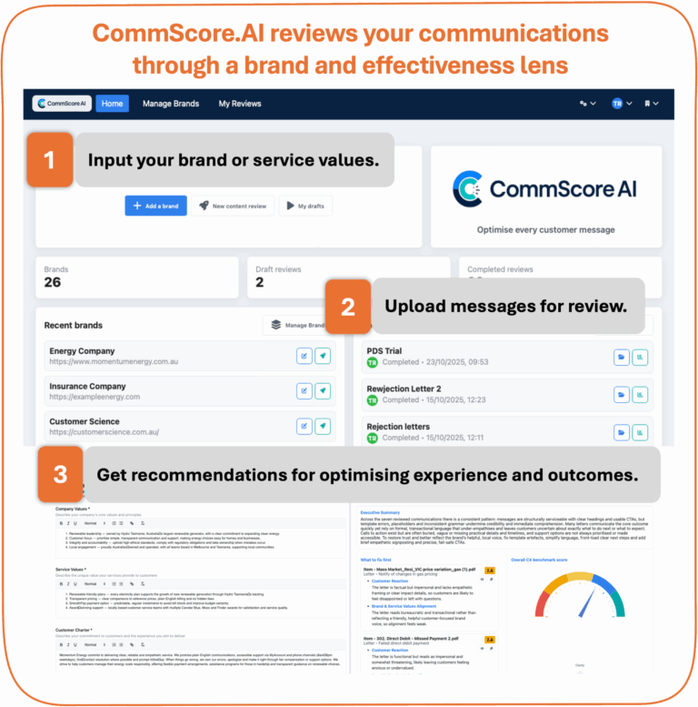 CommScore.AI is the only tool purpose-built to help organisations audit and optimise customer-facing communications. It uses AI to rapidly assess clarity, structure, tone of voice, and alignment with brand values — reducing weeks of manual review into minutes.