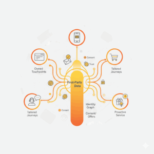 First-party data is information a brand collects directly from customers and prospects through owned touchpoints. The unit includes identifiers, preferences, behavioural events, transactions, and service interactions that customers share with consent. The enterprise uses this data to understand intent, tailor journeys, and measure outcomes across marketing and service. The advantage comes from provenance. First-party data travels with clear consent signals, reliable metadata, and direct relationships. The organisation avoids black-box brokers and reduces risk. A strong first-party spine also improves identity resolution, which connects interactions across web, app, contact centre, retail, and service channels. The brand then uses the identity graph to deliver relevant content, suppress already-purchased items, and trigger proactive service. The value increases as you improve capture quality, governance, and activation discipline.