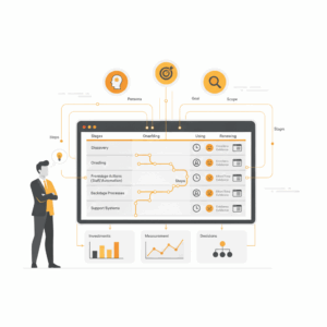 A pragmatic lane stack works as follows. The Customer lane shows steps, needs, and emotions. The Frontstage lane shows visible actions by agents, bots, or UI. The Backstage lane shows internal activities that enable the frontstage. The Support Systems lane lists applications, data stores, and APIs. The Policy and Risk lane records constraints, approvals, and obligations. The Metrics lane tracks outcome and performance measures for each step. This lane structure mirrors service blueprinting conventions, where lines of interaction, visibility, and internal action clarify where demand originates and how it is fulfilled.² When your map always includes these lanes, leaders can map ownership to outcomes and address gaps quickly.⁵