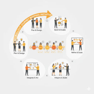 Executives install journey ownership and cadence. A named journey owner takes end-to-end accountability for outcomes and budget. A cross-functional squad combines product, design, data, operations, and compliance. A monthly forum reviews performance, decisions, and risks. Legal and risk partners join early to reduce late surprises. The governance charter specifies decision rights, data access, and service-level objectives. Clear ownership prevents the slow drift back to silo projects.³ ⁹