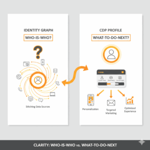 Executives want a single, trusted view of the customer that activates across channels without adding risk. Teams often confuse two adjacent assets that serve this goal. An identity graph connects identifiers that represent the same person or household. A CDP profile aggregates attributes and events about that person for analysis and activation. The overlap creates buying friction, double counting, and governance headaches. Clear roles remove friction and improve time to value.¹ ²