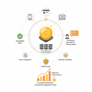 Most self-service models fail at resolution, not intent capture. Customers often find answers but cannot complete transactions. Gartner reports that only a small share of customer service issues are fully resolved in self-service, reflecting design and integration gaps.³ Leaders also see a mismatch between investment and adoption when experiences feel brittle or isolated. The digital concierge addresses this gap by delivering task completion. The unit verifies identity, validates policy, and writes back to systems of record. The concierge treats escalation as a feature. It moves context to live agents with transcripts, history, and next best actions so the customer never repeats information.