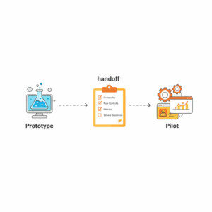 This handoff moves a working concept from a lab setting into a controlled live trial with real users, data, and service levels. A prototype proves desirability and technical feasibility in isolation. A pilot proves operability, risk posture, and business impact in production-like settings. The handoff codifies design intent, expected outcomes, operational constraints, and service ownership so that the pilot behaves like a small, real product. Structured handoffs align to recognized practices in innovation management, which require defined processes to move ideas into value-creating operations.⁴ ⁵
